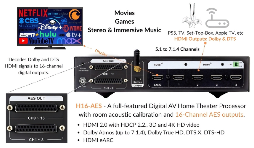 The Nuprime-X H16-AES is a high-performance Digital AV Home Theater Processor featuring AES3 (AES/EBU) digital audio output for integration with professional audio systems.