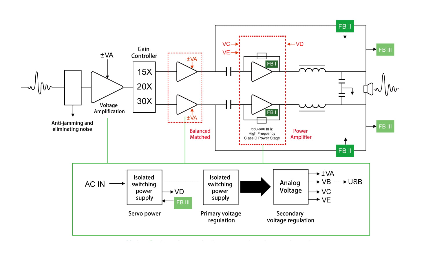 • Gain Adjustable: x15 x20 x30 Three-stage gain adjustment