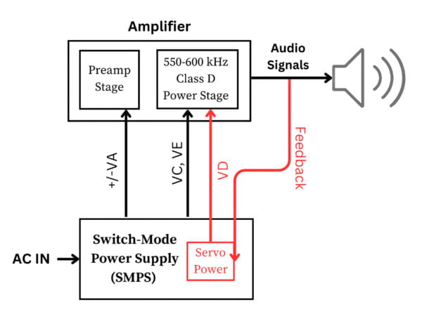 The Adaptive Voltage Switching Power Supply is the most innovative SMPS design introduced by NuPrime for the first time. The amplifier’s output signal feeds back into the power supply’s servo power stage, causing a change in the output voltages supplying the power stage of the amplifier. This design resulted in more details at a low music level and explosive power at a high volume.